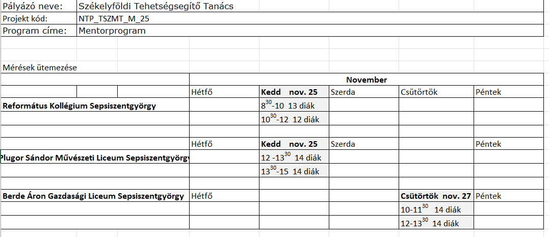 Első lésében mérést végeztünk, gondolkodási és érdeklődési területnek megfelelő kompetenciák meghatározására, majd az eredmények alapján kiválasztunk 4-6 fiatalt, akik a bekerülnek a mentorprogramba, azaz négy hónapon keresztül egyéni fejlesztési terv alapján együttműködik a mentorral képességeinek fejlesztésében. A célcsoportot a sepsiszentgyörgyi Berde Áron Közigazgatási Liceum, Puskás Tivadar Művészeti Liceum és Református Kollégium XI. osztályai képezik, közülük válogatjuk ki a mentorprogramba kerülő diákokat. A mérési eszközök kiválasztásában, valamint az eredmények összegzésében Dr. Páskuné Kiss Jutka, Dr. Kondé Zoltán és Dr. Abari Kálmán a Debreceni Egyetem Pszichológiai Intézetének habilitált egyetemi docense nyújt szakmai segítséget.